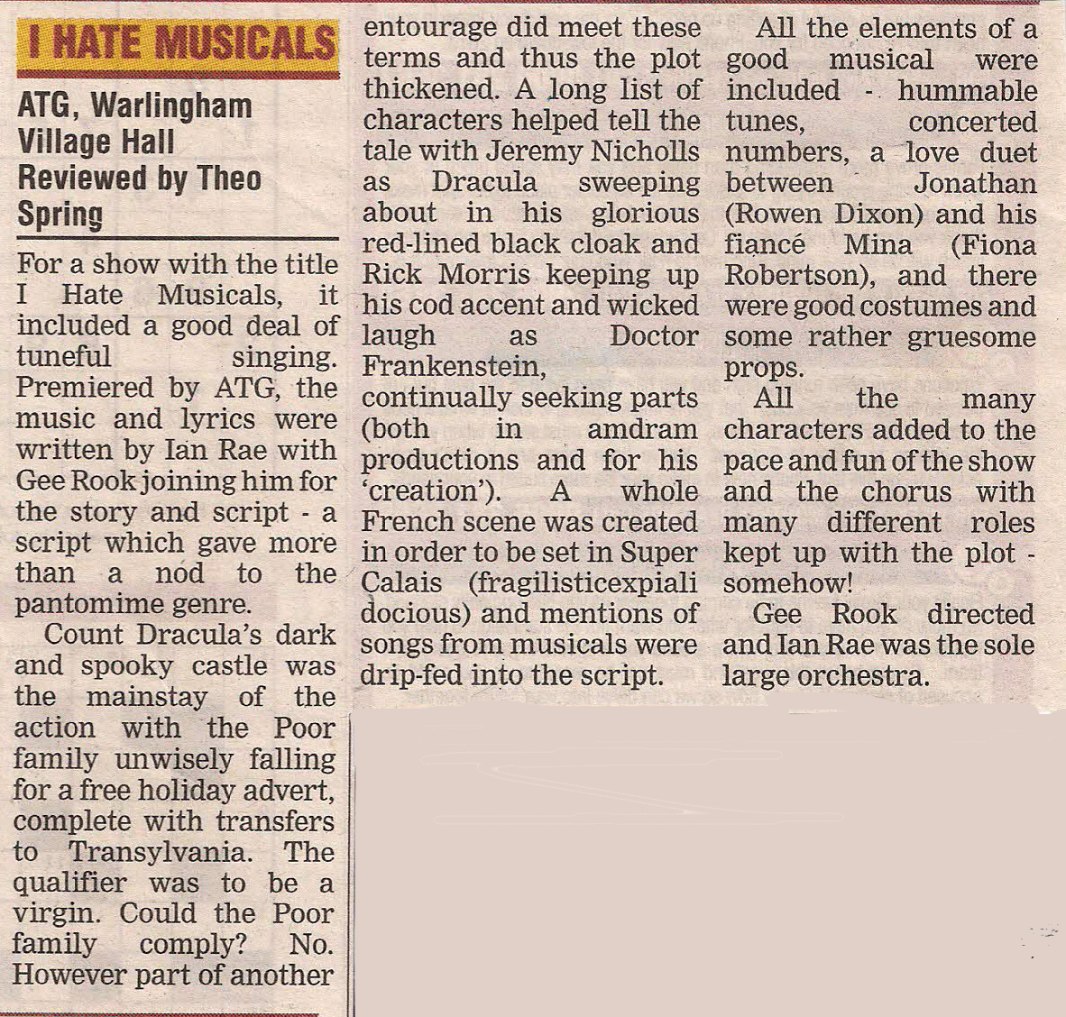 "I HATE MUSICALS" is a rather silly musical with the Story, Book, The World Premiere was in late Nov / early Dec 2012 "I HATE MUSICALS - The evening was a blast, a cast of people who were all having such a good time that they took the audience along with them and made us all leave smiling and tapping our feet." - Sardines Magazine For the full review please visit Sardines Magazine "I HATE MUSICALS - All the elements of a good musical were included - hummable tunes, concerted numbers a love duet and good costumes and rather gruesome props" - Croydon Advertiser For the full review please visit Click Here For details of availability for staging amateur productions of "I Hate Musicals" Contact An extensive blog related to planning and rehearsals is available at IHM BLOGSPOT Exclusive and Risque! - Which one fills the Sweatshirt best Competition - Enter here Purchase "I Hate Musicals" (and "I Love Musicals) merchandise Here